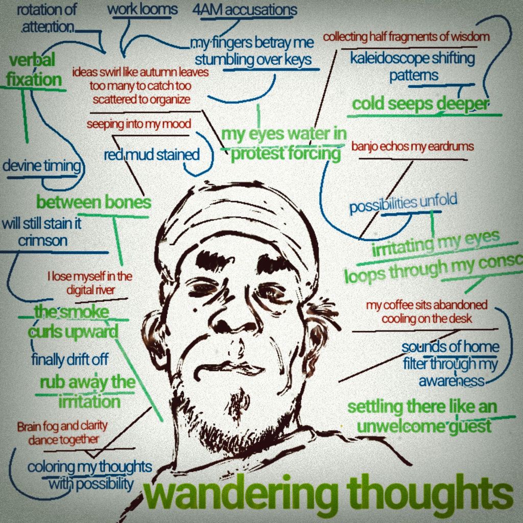 Brain fog and clarity dance together as I stare at this blank page two hours into waking and already writing ideas swirl like autumn leaves too many to catch too scattered to organize my coffee sits abandoned cooling on the desk while I lose myself in the digital river of tumblr twitter facebook pinterest collecting half fragments of wisdom and art and absurdist humor that somehow makes perfect sense in my wide awake state a banjo echos my eardrums and has become the soundtrack to my morning the fifth time I’ve heard this song so far lyrics seeping into my mood coloring my thoughts with possibility maybe I’ll post it in my motivational music maybe I won’t who knows my fingers betray me stumbling over keys backspacing to correct the misspelled words my brain moves too quickly to spell properly sounds of home filter through my awareness Kayleigh sleeping in her bedroom when did she finally drift off? I fell asleep around seven Carly shuffling to the bathroom my thoughts are a kaleidoscope shifting patterns with each rotation of attention Thursday just one more workday before the freedom of the weekend possibilities unfold hiking trails waiting to be discovered rivers calling for canoes the historic grounds of Shiloh beckoning but it’s suppose to rain and I know my canoe needs cleaning because the red mud stained the inside from the last adventure and it would be pointless to clean maybe knowing that the Alabama waters will still stain it crimson again before summer’s end but there’s something satisfying about starting fresh the clock blinks 4AM accusations work looms won’t be late never late always early I’m on devine timing I’m already making my mental checklist gas station stops cigarettes to buy drinks and some kind of lunch my fingers twitch with anticipation a cigarette would be perfect right now I’ll indulge before my morning work routine begins the smoke curls upward as I glance at my computer screen irritating my eyes and the screen’s glow mixing with rising smoke my eyes water in protest forcing me to set everything down and rub away the irritation ten seconds of blindness then back to clarity A cough echoes from Kayleigh’s room hope she’s not getting sick we’ve made it through winter without the usual seasonal plagued winter winters almost over thank god and thank god for everything and all things known and unknown he has done and will do I used to love Michigan’s brutal embrace when I was younger but now the cold seeps deeper finding the spaces between bones making me irritated and then settling there like an unwelcome guest the second time I’ve used irritated that could be the third or the fourth it might become today’s verbal fixation word of the day there’s always one phrase or one word that loops through my consciousness becoming the day’s unofficial theme my cigarette burns down to nothing marking ten minutes of written wandering thoughts captured in digital permanence minus the ten seconds that I had to rub my irritated eye