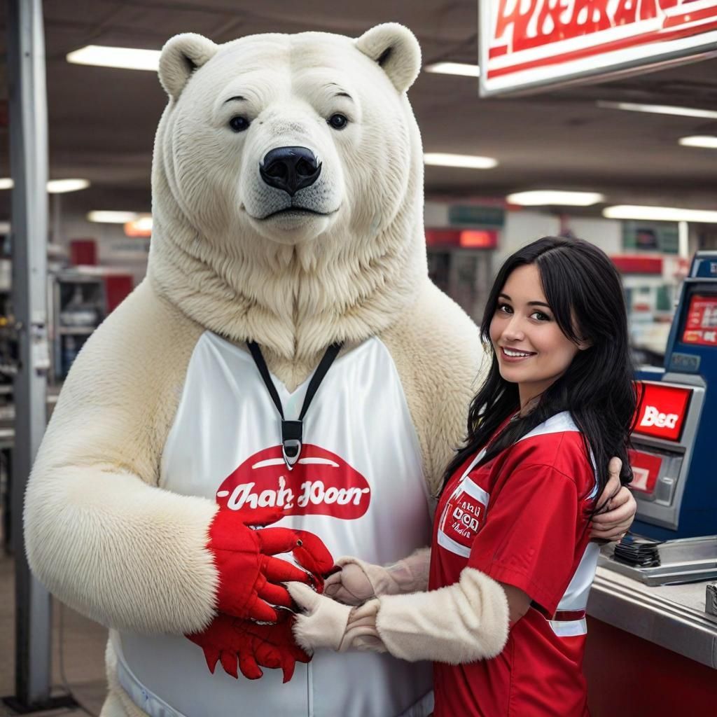 “It’s really not about you,” I said gently but firmly. “Bob… he’s the owner slash, manager … his soulmate requested a name change for the gas station, asked him to evolve the whole place into something better than just a place to buy gas and snacks. Bob took it upon himself to dress the bear because a plain polar bear is boring. And that winking eye? … a gesture of appreciation and love to his lobster friend with a promise. The Christmas lights make it sparkle at night. It’s about Bob’s relationships and commitments, not secret messages to customers.”